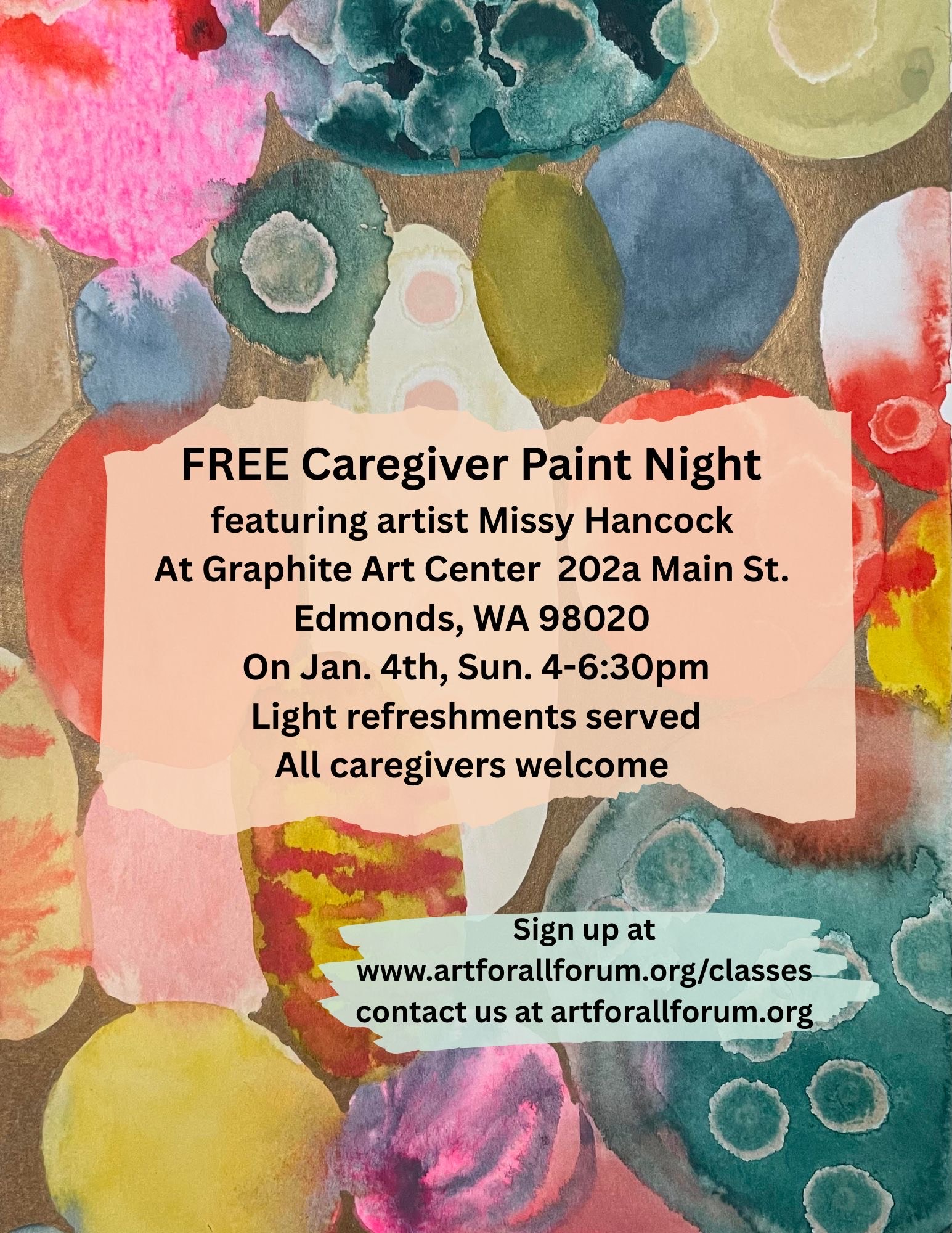 Sunday, January 4, 2026, 4:00pm-6:30pmFree art workshop for all caregivers. No experience necessary. Light refreshments included. Instructor: Missy Hancock